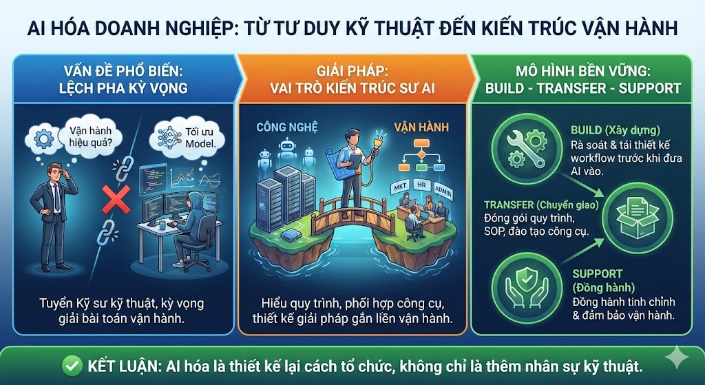 một hướng tiếp cận bền vững hơn là xây dựng kiến trúc vận hành có tích hợp AI, đó là mô hình Build – Transfer – Support.